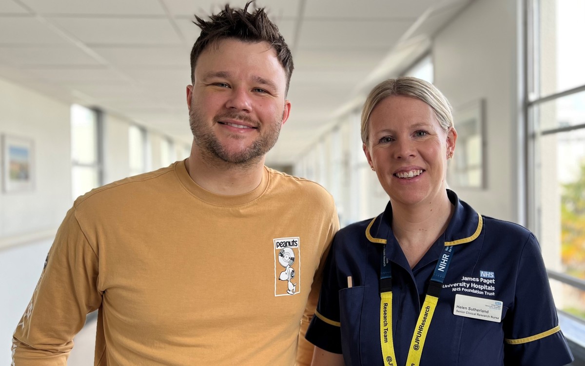 A patient is urging others to take part in research after being involved in a landmark national clinical trial at the James Paget University Hospital.