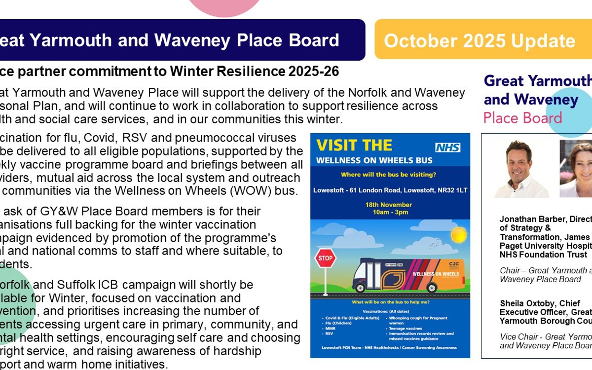 Great Yarmouth and Waveney Place will support the delivery of the Norfolk and Waveney Seasonal Plan, and will continue to work in collaboration to support resilience across health and social care services, and in our communities this winter.
